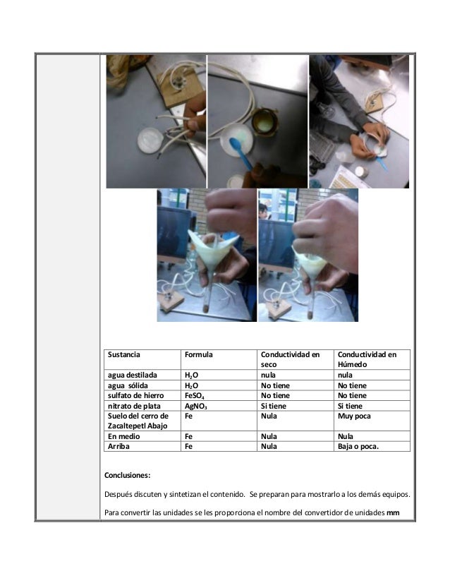 Y la practica que hicimos fue detectar si las sustancias dadas por el profesor conducían electricidad en seco y húmedo. Además de las muestras de los suelos del cerro de Zacatepetl.